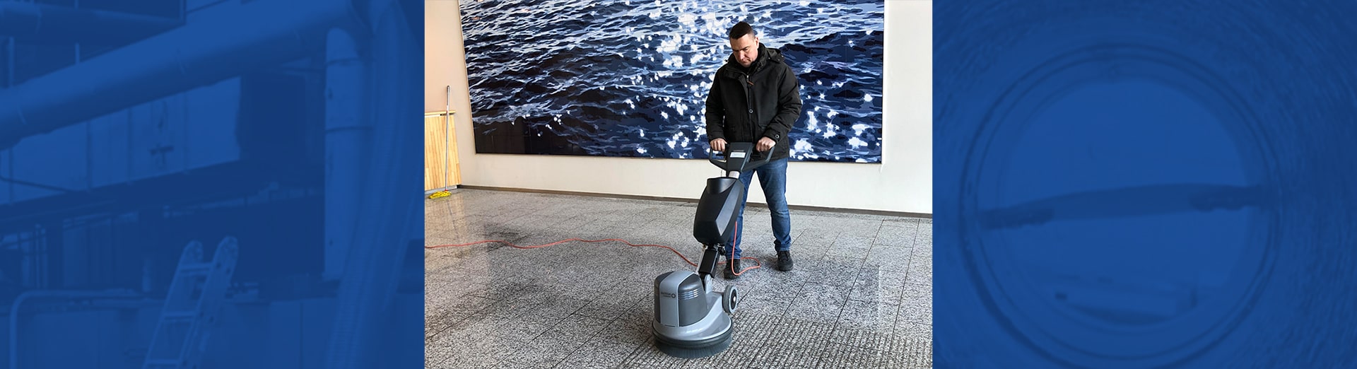 Több száz m2 erősen szennyezett díszburkolat megtisztítása. (Van Genechten Packaging Kft.)